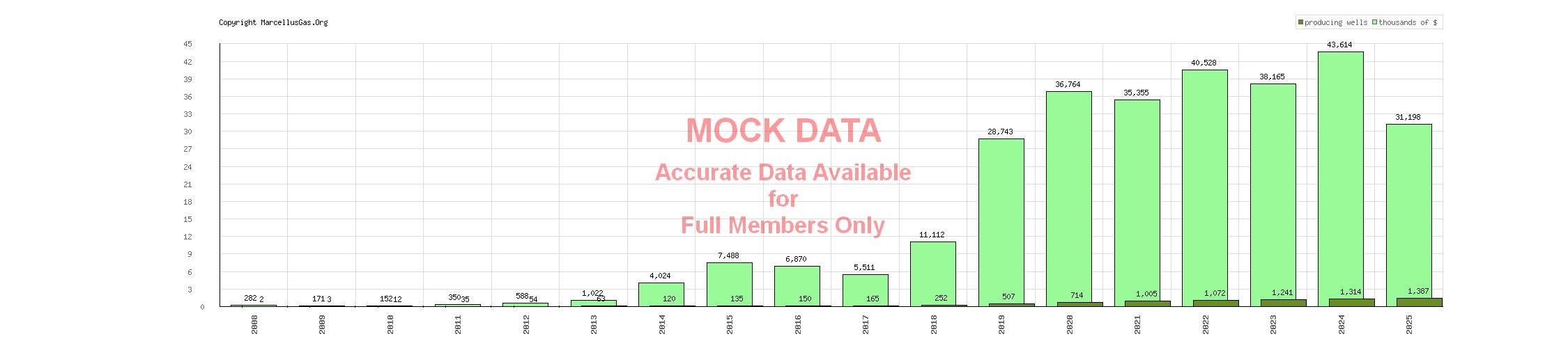 The dollar values shown represent the production average, in thousands of dollars, per well. Values are based on "At The Wellhead" (ATW) pricing of $2.95 per MCF (thousand cubic feet) - the most recent pricing figure available from the U.S. Energy Information Administration. The darker bar represents the number of wells with reported production values during that year.