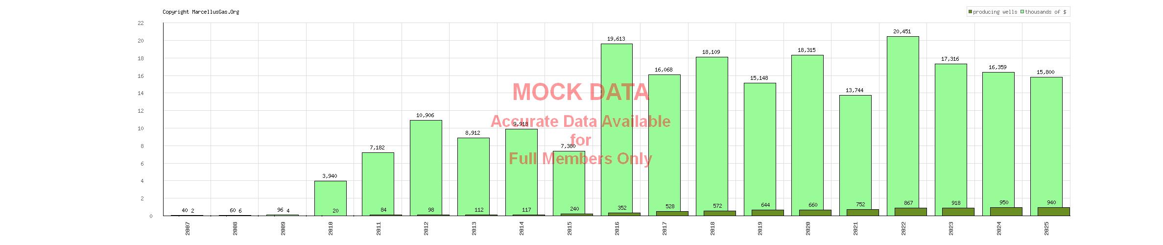 The dollar values shown represent the production average, in thousands of dollars, per well. Values are based on "At The Wellhead" (ATW) pricing of $3.97 per MCF (thousand cubic feet) - the most recent pricing figure available from the U.S. Energy Information Administration. The darker bar represents the number of wells with reported production values during that year.