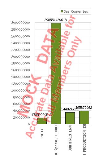 The dollar values shown represent the production average, in thousands of dollars, per well. Values are based on "At The Wellhead" (ATW) pricing of $3.30 per MCF (thousand cubic feet) - the most recent pricing figure available from the U.S. Energy Information Administration. The darker bar represents the number of wells with reported production values during that year.