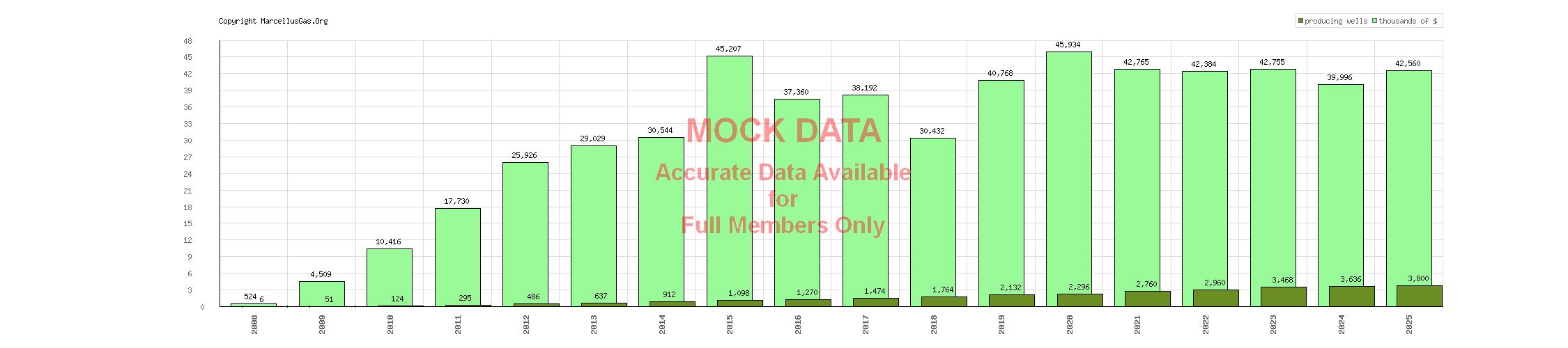 The dollar values shown represent the production average, in thousands of dollars, per well. Values are based on "At The Wellhead" (ATW) pricing of $3.97 per MCF (thousand cubic feet) - the most recent pricing figure available from the U.S. Energy Information Administration. The darker bar represents the number of wells with reported production values during that year.